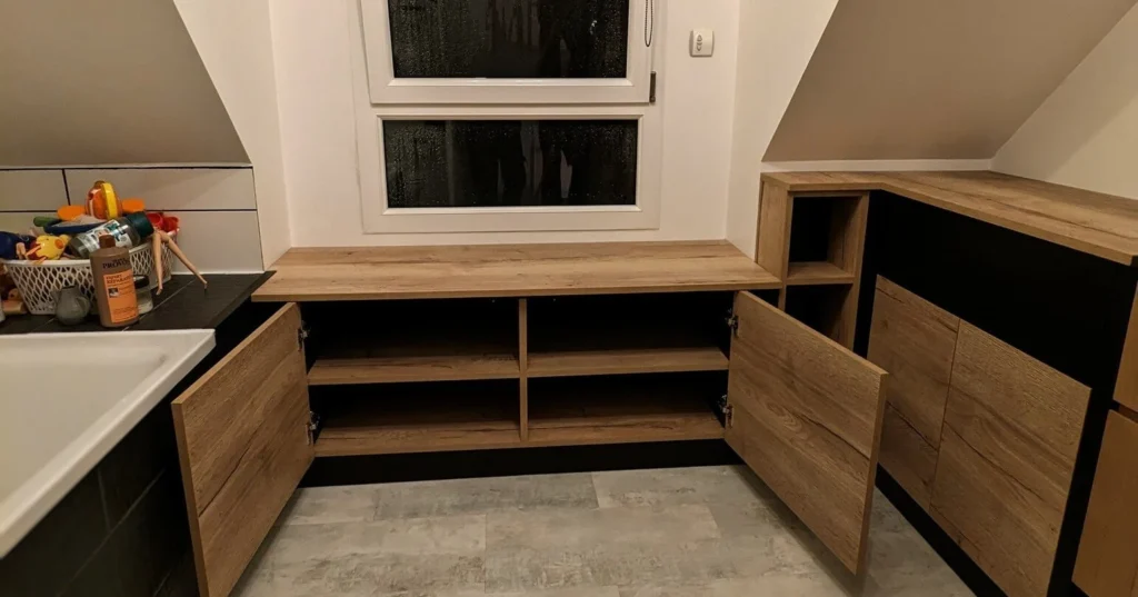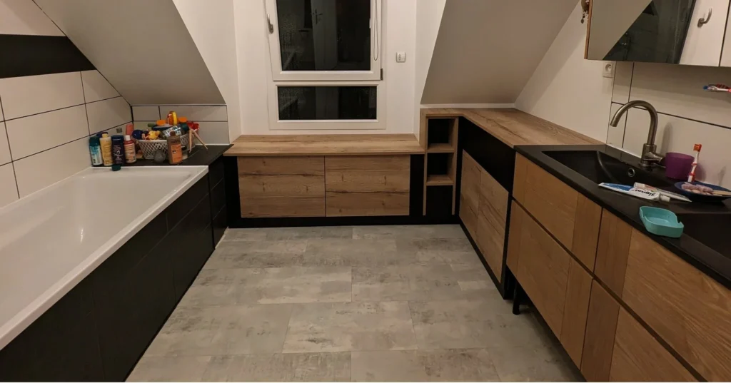 Créer des rangements entre le meuble vasque et la baignoire qui s’harmonisent au mieux avec les couleurs de la baignoire et du meuble vasque.
